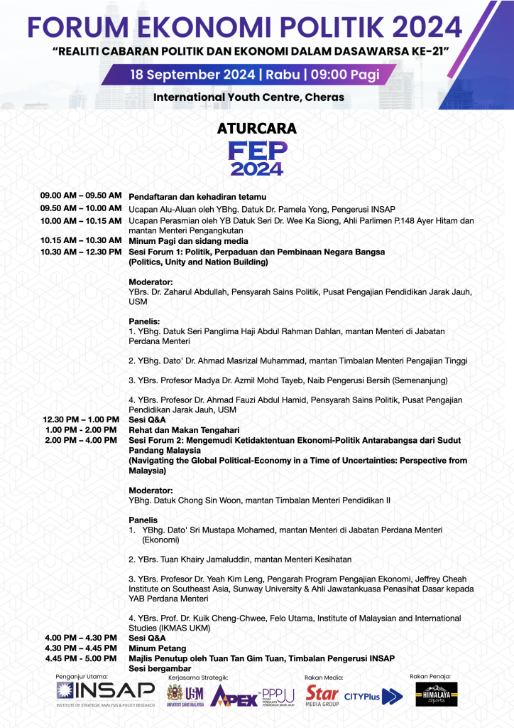 #FEP2024 dianjurkan buat julung kalinya melalui kerjasama strategik dan pemeteraian Perjanjian Persefahaman (MoU) oleh Institute of Strategic Analysis and Policy Research (INSAP) bersama Bahagian Sains Politik, Pusat Pengajian Pendidikan Jarak Jauh, Universiti Sains Malaysia (PPPJJ-USM).